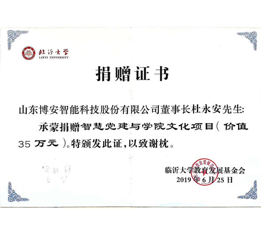2019臨沂大學捐贈證書-智慧黨建與學院文化項目35萬元設備