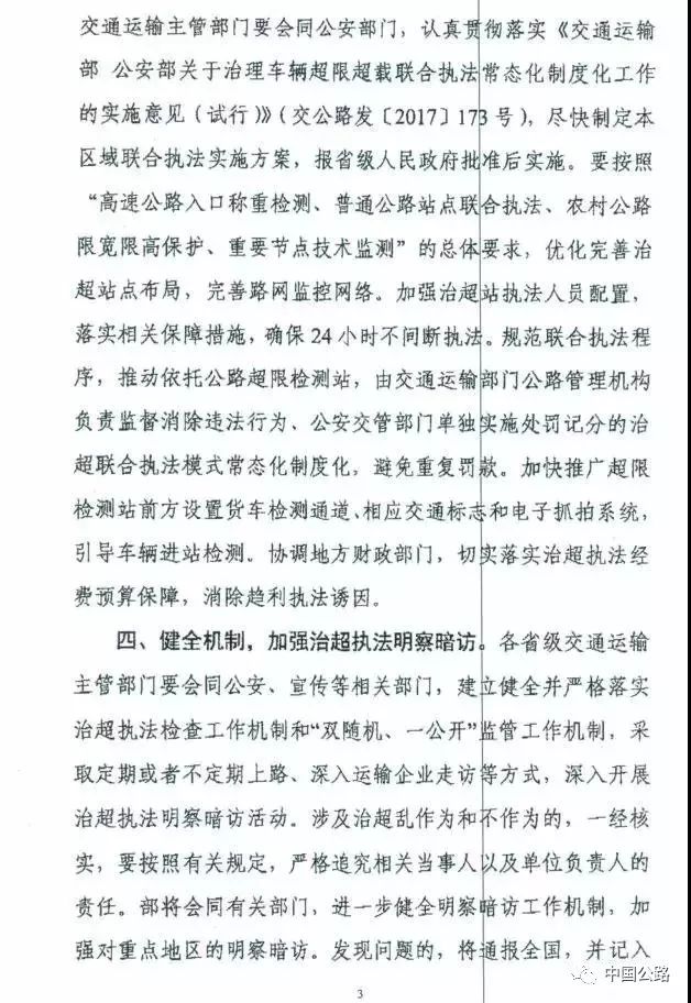 四、健全機制,加強治超執法明察暗訪。各省級交通運輸主管部門要會同公安、宣傳等相關部門,建立健全并嚴格落實治超執法檢查工作機制和“雙隨機、一公開”監管工作機制,采取定期或者不定期上路、深入運輸企業走訪等方式,深入開展治超執法明察暗訪活動。涉及治超亂作為和不作為的,一經核實,要接照有關規定,嚴格迫究相關當事人以及單位負責人的責任。部將會同有關部門,進一步健全明察暗訪工作機制,加強對重點地區的明察暗訪。發現問題的,將通報全國,并記入“十三五”國檢考核成績。