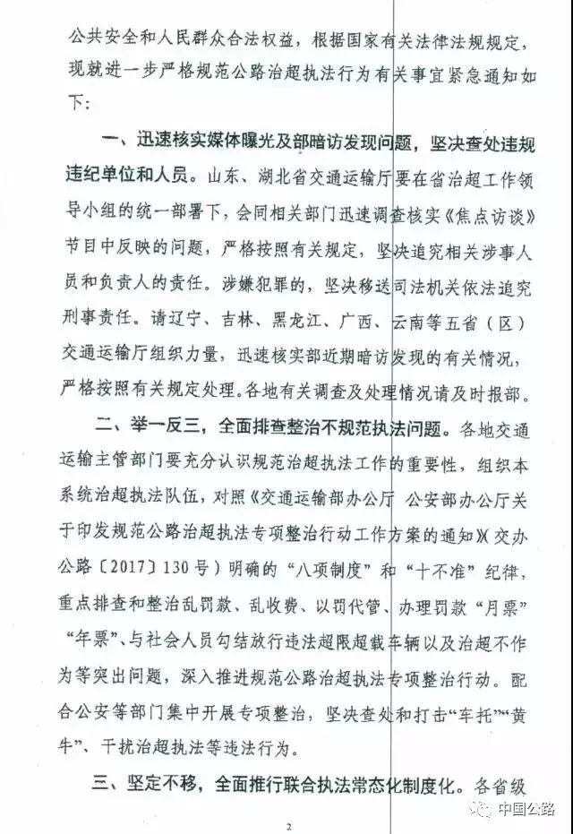 1月23日,中央電視臺《焦點訪談》欄目以“沉重的超載”為題,報道了山東和湖北兩省部分地區在公路治超執法過程中,存在的“車托”“黃牛”“月票”等問題。此前,我部結合規范公路治超執法專項整治行動,組織力量,分三批次赴八個省份開展了明察暗訪,也發現各地不同程度地存在著“黃牛”、治超不作為等現象,并通知各地調查核實,嚴格按照規定處理。為貫徹落實黨的十九大精神,進一步優化營商環境,切實維護社會公共安全和人民群眾合法權益,根據國家有關法律法規規定,現就進一步嚴格規范公路治超執法行為有關事宜緊急通知如下: